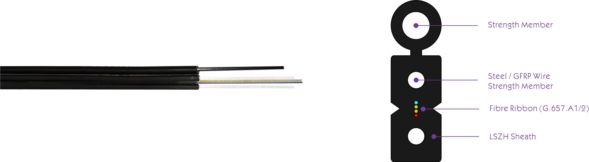 includes central optical Ribbon fibre(s) with 2 parallel FRP/Steel wires as the strength members placed on both sides,and an additional strength member(steel wire),Finally a LSZH sheath is extruded outside.